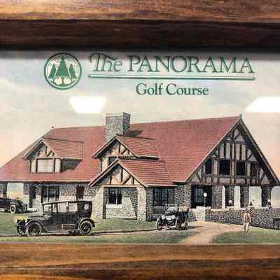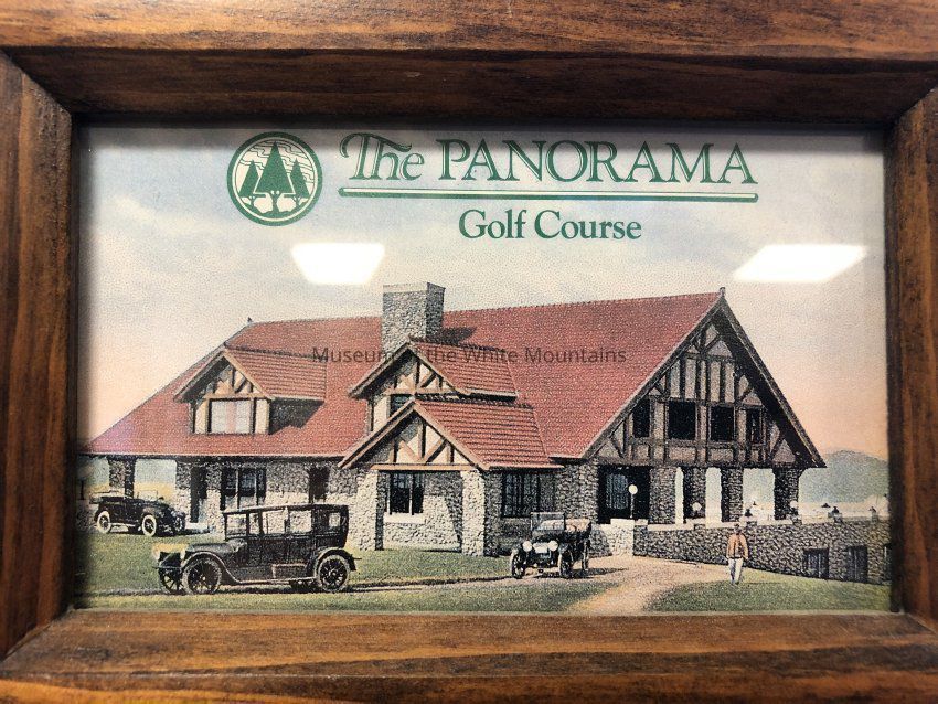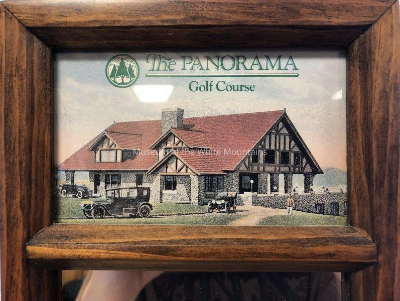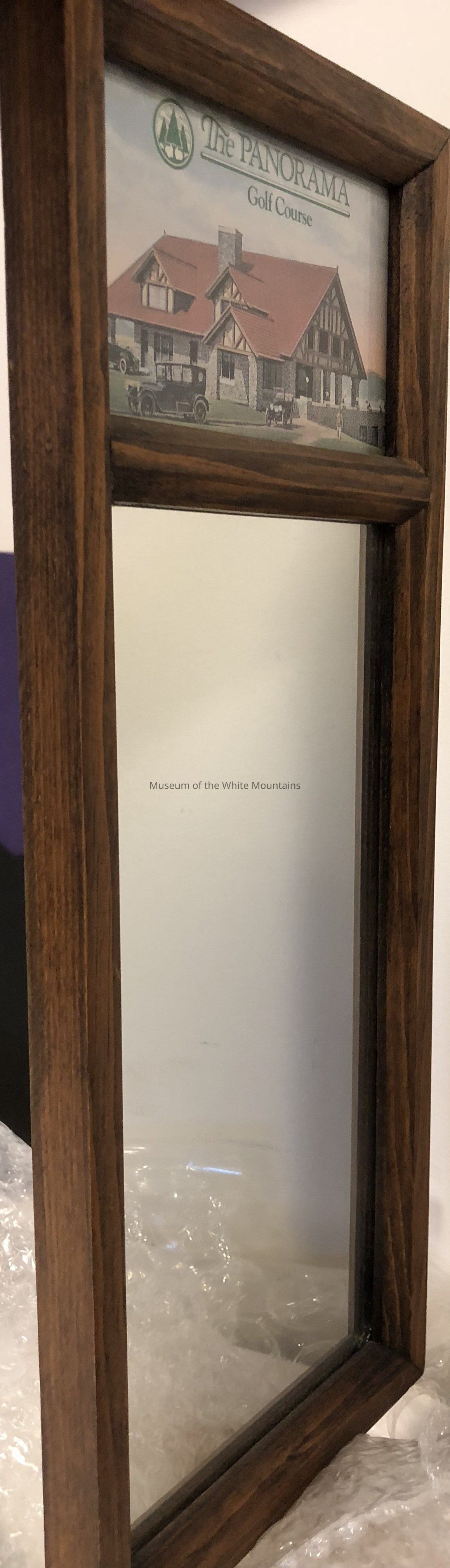 This is a framed print which is connected to a mirror. The print depicts a clubhouse of some sort on the Panorama Golf Course, Balsams Hotel. Automobiles, as well as one person are visible in this print. Date range: 1915-1925.Collection