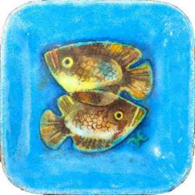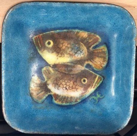 This enamel on copper dish depicts a pair of fish positioned back to back. Undated.Acquisition