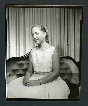 Black and white portrait photograph of a young woman. She is sitting on a couch in a pose with her hands on her lap facing the left. She is wearing a white dress and has a pearl necklace and a watch on. Background is a white curtain.