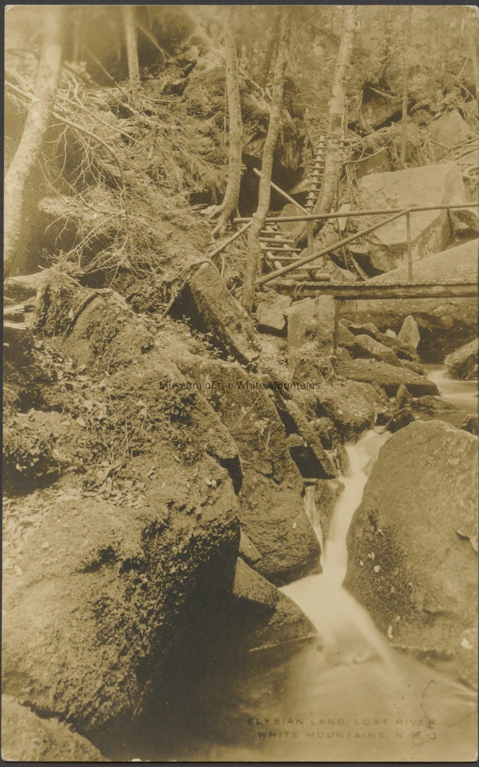 Sepia toned image of a river flowing through many rocks. Footbridges and stairs are in view. Caption reads, “Elysian Land, Lost River, White Mountains, NH.”
