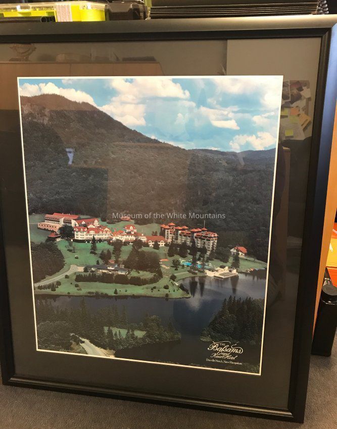 A framed image shows the Balsams Grand Hotel in the summer where Lake Gloriette can be seen in the lower section of the picture. The multiple buildings of the hotel with red roofs sit in the center of the frame with mountains in the background. There is a sticker on the back of the frame that says "12 Years Excellence Felton Street Studios, Waltham, MA"