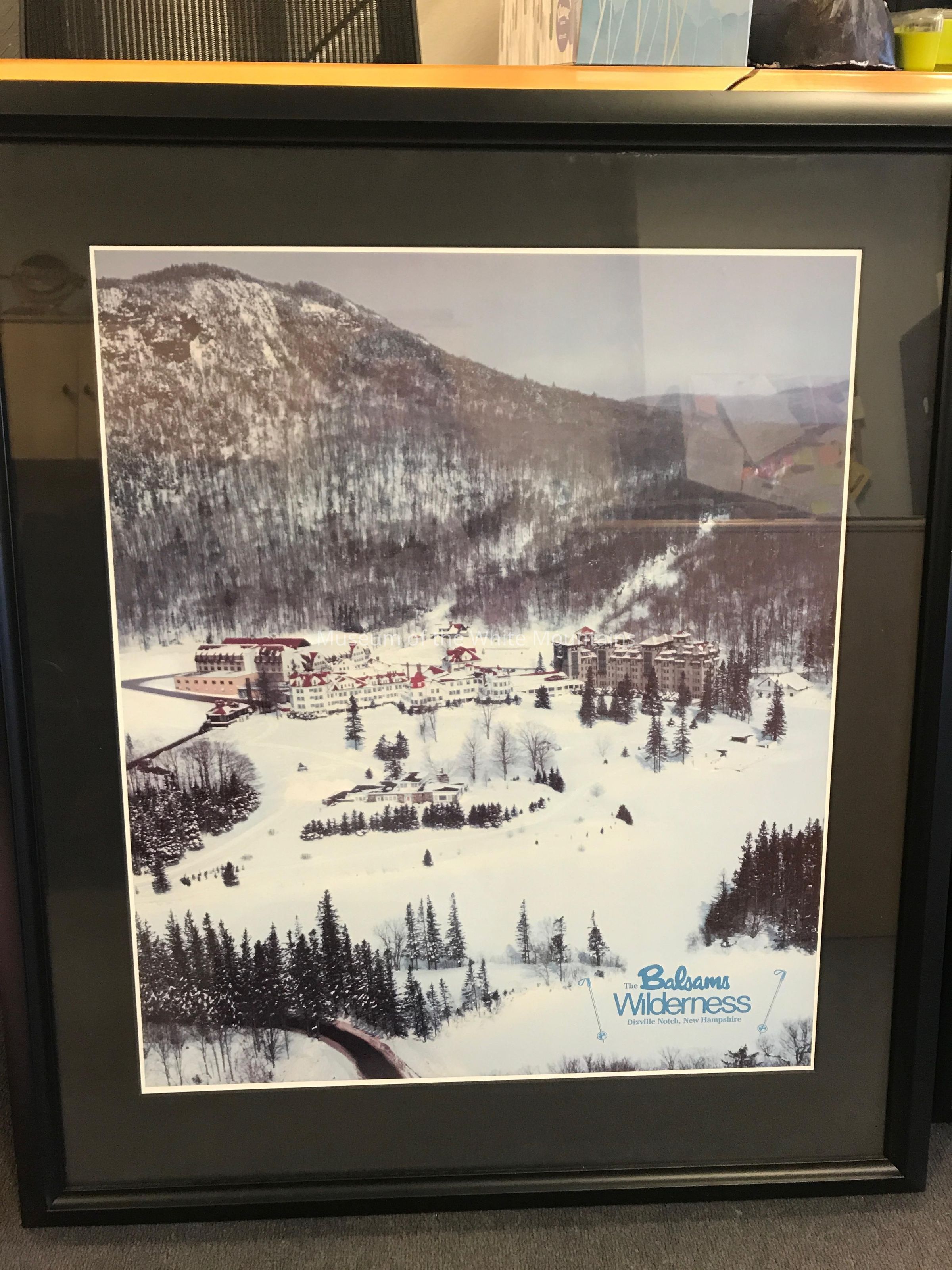 This image depicts the Balsams Grand Hotel in the Winter with the mountains and Lake Gloriette covered in snow. The red roofs of the hotel stand out against the snow and there appear to be trails of some sort, possibly ski trails running through the lawn of the Balsams. On the back of the image, there is a sticker that reads "12 Years Excellence Felton Street Studios, Waltham, MA"