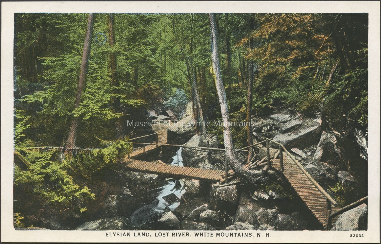 Colored image of a footbridge crossing a river among rocks and trees. Caption reads, “Elysian Land, Lost River, White Mountains, NH.”