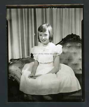 Black and white portrait photograph of a young girl. She is sitting on a couch in a pose with her hands on her lap. She is wearing a white dress and has a cross necklace on. Background is a white curtain.
