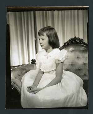Black and white portrait photograph of a young girl. She is sitting on a couch in a pose with her hands on her lap. She is wearing a white dress and has a cross necklace on. Background is a white curtain. On back written in pencil, "2 for sending 1 for here".