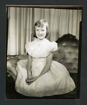 Black and white portrait photograph of a young girl. She is sitting on a couch in a pose with her hands on her lap. She is wearing a white dress and has a cross necklace on. Background is a white curtain.