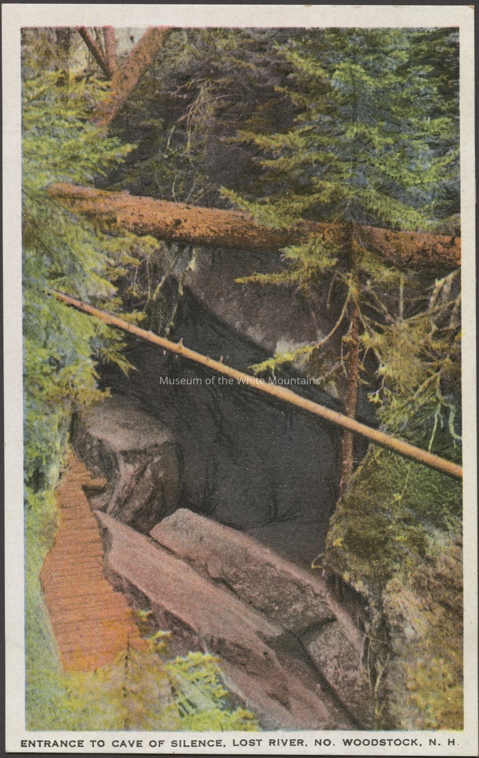 Colored image of a cave within rocks and trees. A walkway is in view. Caption reads, “Entrance to Cave of Silence, Lost River, North Woodstock, NH.”