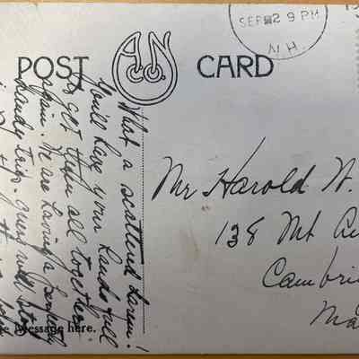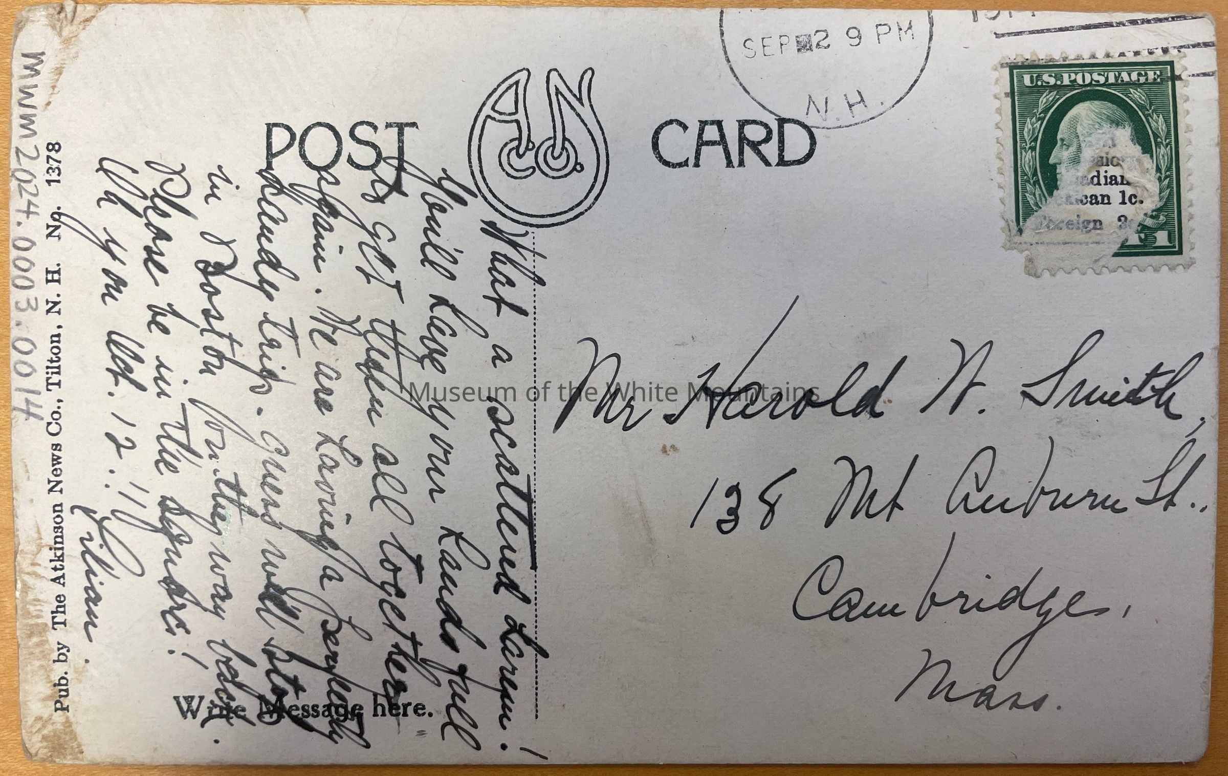 Back Description: Typical postcard back. Postmarked September 2, [191?] Written to Mr. Harold N. Smith, 138 Mt. Auburn St., Cambridge, Mass.