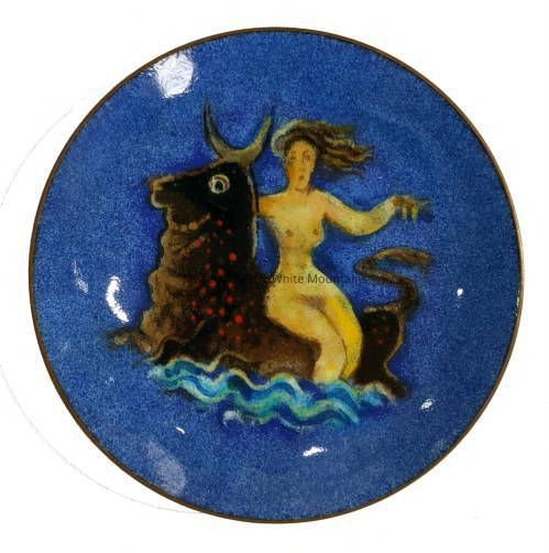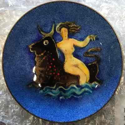 Enamel on copper plate depicting a woman sitting on a bull. Undated.Acquisition
