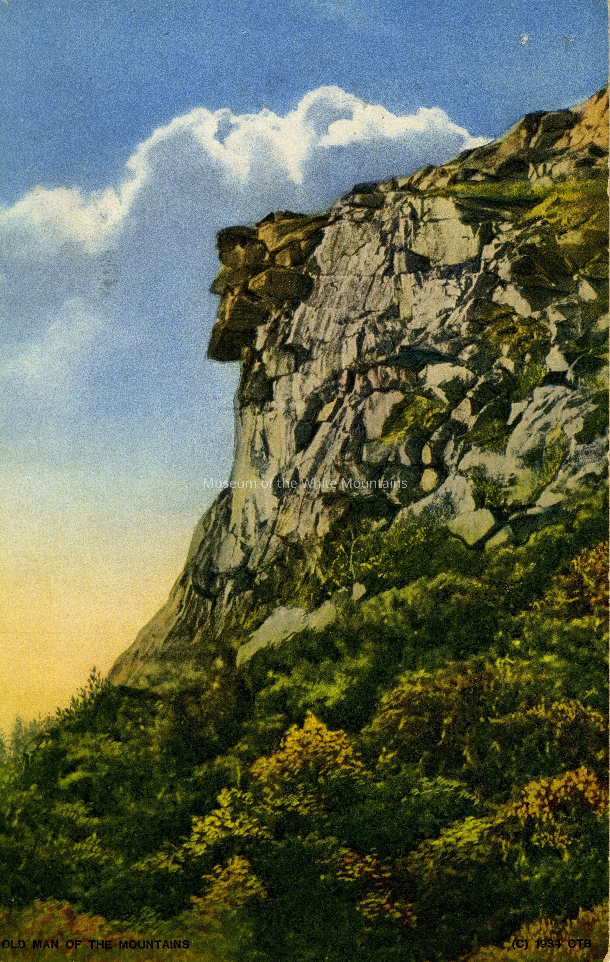 Colorized image of The Old Man of the Mountain in Franconia Notch from an upward perspective. The image features a mostly sunny day with some clouds in the sky and early fall foliage in the foreground. Caption reads "Old Man of the Mountains."