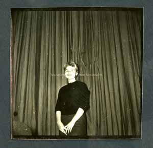 Black and white photograph portrait of an unidentified woman. She is wearing a black shirt with a dark skirt. Behind her is a dark curtain. On back stamped in ink, " Photograph by Dan Noel Nov 22 1957". Written in pencil, "608".