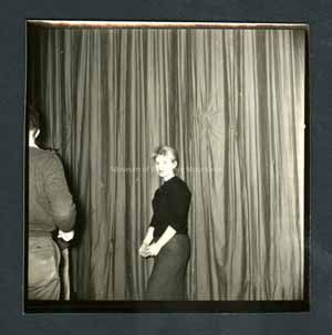 Black and white photograph portrait of an unidentified woman. She is wearing a black shirt with a dark skirt. Behind her is a dark curtain. To the far left there is a man standing. Stamped on back in ink, "Photograph by Dan Noel Nov 22 1957." Written in pencil, "609".