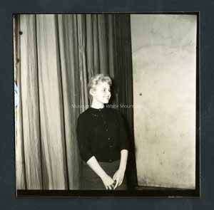 Black and white photograph portrait of an unidentified woman. She is wearing a black shirt with a dark skirt. Behind her is a dark curtain. Stamped in ink on back, "Photograph by Dan Noel Nov 22 1957". Written in pencil, "603".