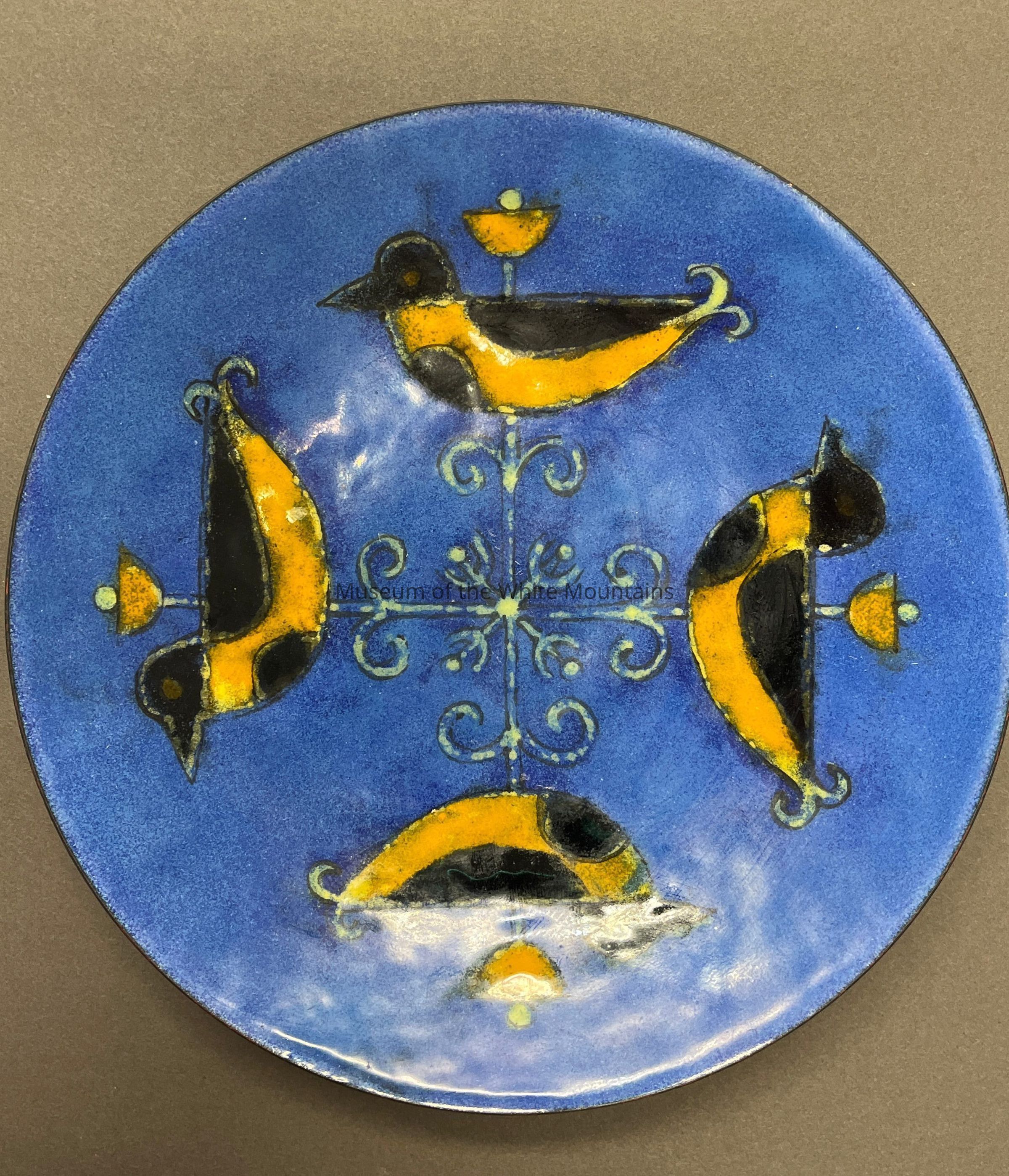 Enamel Bowl is blue with bird in a weathervane type formation. The birds appear to be black with an orange belly probably American Robins.