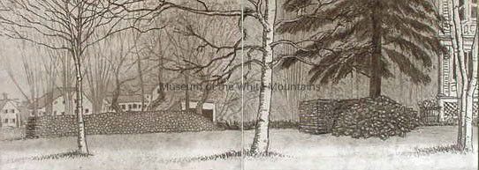 Keeping warm is a year-round occupation in the mountains where Rumney is located. Logging trees, trucking, cutting logs, splitting the drums, trucking again, stacking in a specific manner, toting into the house, kindling, starting a fire in the wood stove, overnight wood loads, maintaining the stove, stove pipes and chimney is a perpetual series of tasks. The warmth of the fire when it is cold and raw is worth it. This image is a two-plate design to correspond to the proportion of the location.Acquisition
