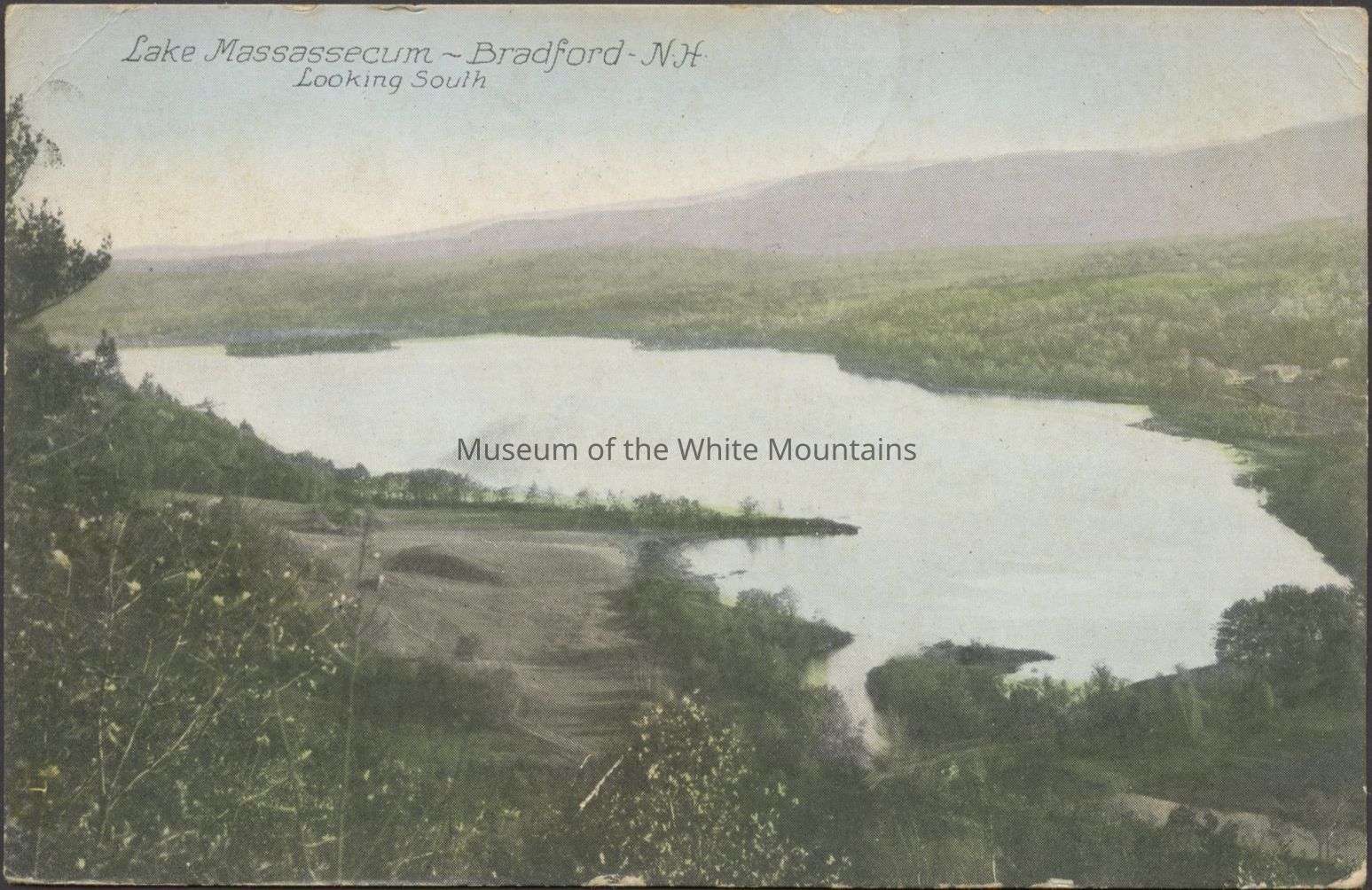 Colored image of a body of water surrounded by trees and grassy areas. Caption reads, “Lake Massassecum, Bradford NH, looking south.”