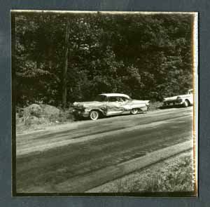 Black and white photograph of a car that was involved in a car crash. The side of the car is damaged. Behind the car is another parked car. The cars are off on the side of the road. In the background are woods. On back stamped in ink, "Photograph by Dan Noel". Written in pencil is, "398".