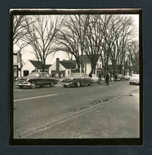 Black and white photograph of a car that had damage to the right side. The front light of the car is damaged. The car is parked on the side of a road. Several other cars are parked on the side. Behind the car that is damaged are several people standing in the road. On the sidewalk is a person riding a bike and a person standing. On the left is an American flag and a sign for the Post Office. On back stamped in ink, "photograph by Dan Noel, Nov 30 1957". Written in pencil, "615".