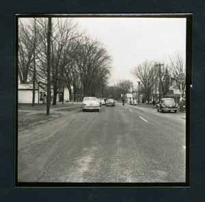 Black and white photograph of a street. Several cars are parked on the side of the road. Houses are on both sides of the street. A group of people are standing on the right. A Sunoco gas oil sign is in the front right. On back stamped in ink, "Photograph by Dan Noel. Nov 30 1957". Written in pencil, "617".