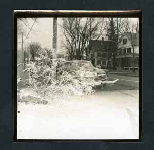 Black and white photograph of car damage. The car's bumper is sticking straight out and the right light is out. An Electrical line is next to the car on the left. In the background are houses.On back stamped in ink, "Photograph by Dan Noel Nov 30 1957". written in pencil, "618".
