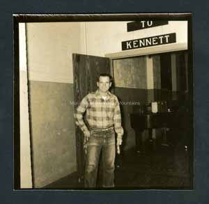 Black and white photograph of a man posing. The man is standing in front of a doorway. Abover the doorway is a sign that says, "To Kennett". In the background is a table with boxes on top. Stamped on back, "Photograph by Dan Noel Nov 22 1957." Written in pencil, "622".