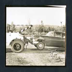 Black and white photograph of a car getting hooked up to a tow truck. The car being attached to the back of the tow truck is damaged. In front of the car is a tricycle. On backed stamped in ink, "Photograph by Dan Noel Nov 23 1957". Written in pencil, "626".