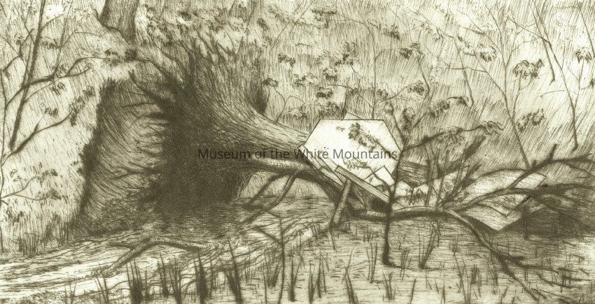 This print was the prototype for the NH Village Suite. It is the lone drypoint engraving in the series. Its story is again metaphorical. My project poet colleague, Edie Patridge, lives around the corner from me. We had sons of identical age and they were good friends. They maintained this treehouse in the entrance to the gully on what is called Steel Brook. They grew up and moved away. The abandoned treehouse eventually collapsed. Called back into the environment, it too has disappeared.Acquisition