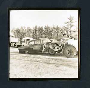 Black and white photograph of a car getting hooked up to a tow truck. The car being attached to the back of the tow truck is damaged. Behind the car is several other trucks, a garage and a house. On back stamped in ink, "Photograph by Dan Noel Nov 23 1957." Written in pencil, "627."