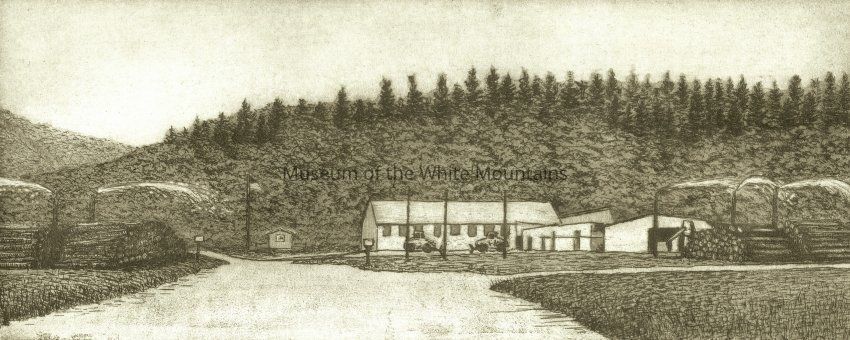 The stacks of logs outside the mill can be great. The ridge behind the mill is in Wentworth, the next town. The power lines create their own highway traveling many miles of over the hills heading south with their electricity. I especially enjoyed creating the water sprinklers in the etching. Loggers come from all over the north country to bring log loads here.