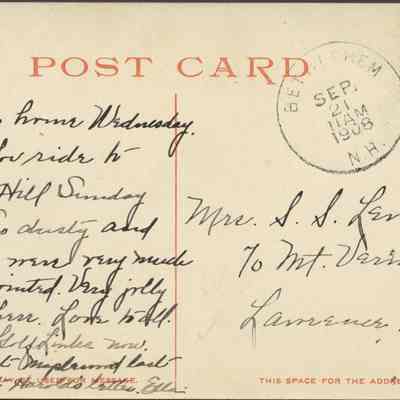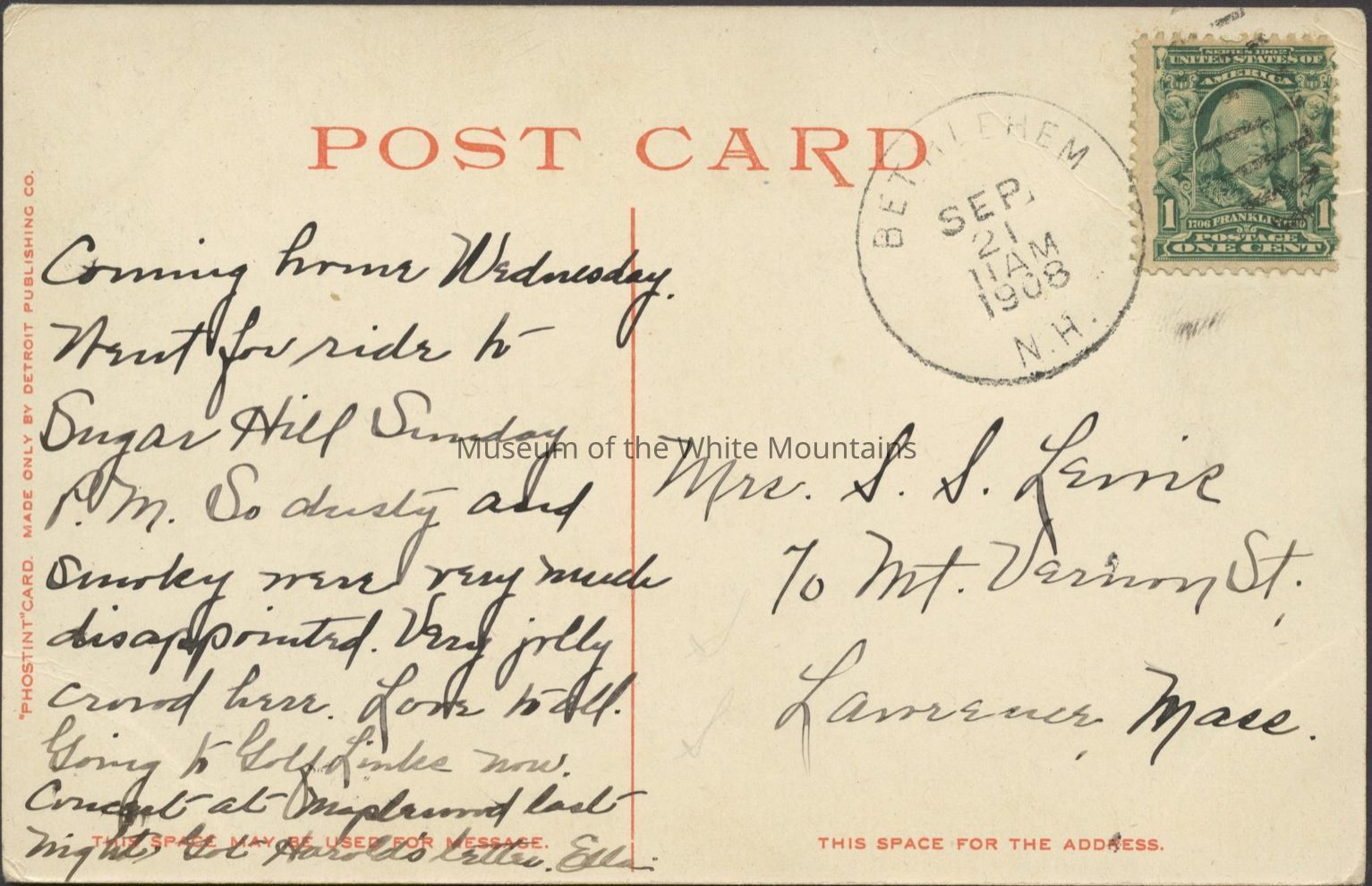 Transcription: "Coming home Wednesday. Went for ride to Sugar Hill Sunday P.M. So dusty and some were very much disappointed. Very Jolly crowd here. Love to all. Going to golf Lake now. Concord at … last night. Got Harold's letter. Ella."