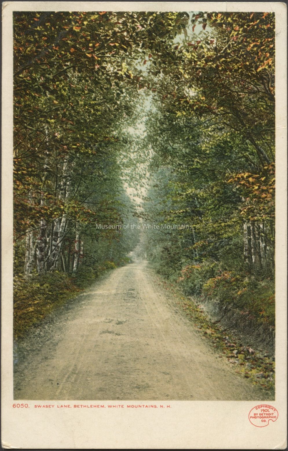Colored image looking down a dirt road lined with colorful trees. Caption reads, “Swasey Lane, Bethlehem, White Mountains NH.”