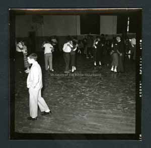 Black and white photograph of a school dance. The students are in a gym, dancing. Stamped on back in ink, "Photograph by Dan Noel, Dec 6 1957." Written in pencil, "652."