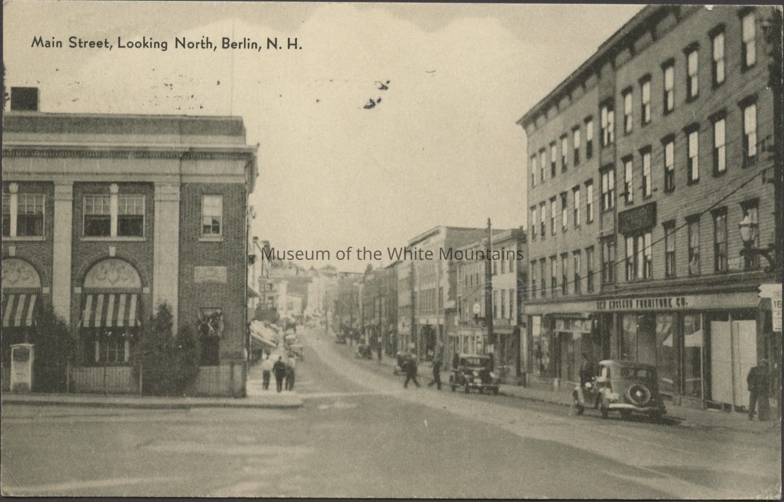 Black and white image of a paved city street lined with buildings, automobiles, people, utility lines. Caption reads, “Main Street, Looking North Berlin NH.”
