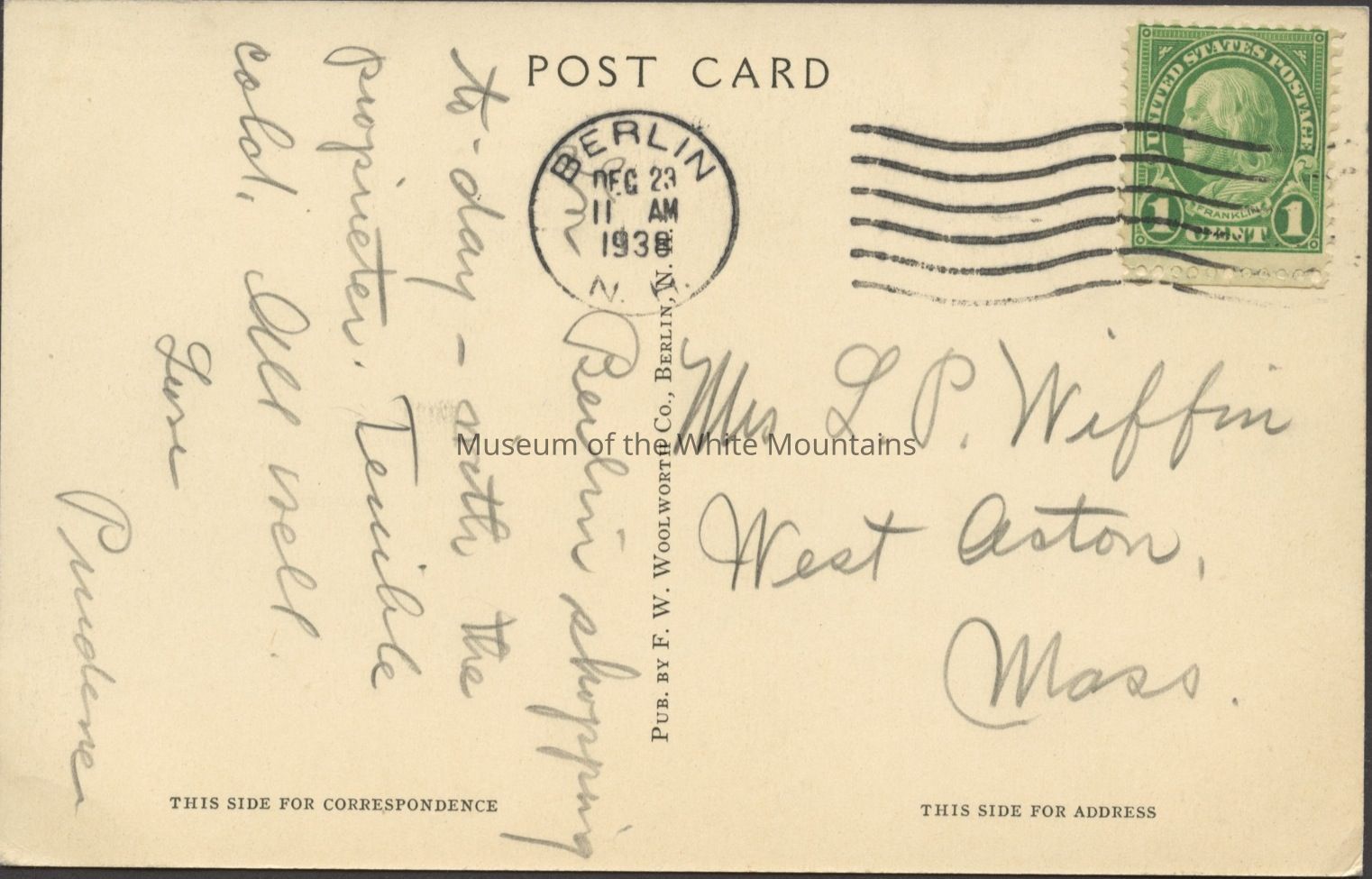 Back Description: Typical postcard back. Features a handwritten note, postmark, and postage stamp.