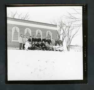 Black and white photograph portrait of a ski team. Outside in the snow is a group of students posing with skies. Behind them is a building. In the background are trees and a house. Stamped on the back in ink, "Photograph by Dan Noel, Dec 3 1957." Written in pencil, "656."Collection