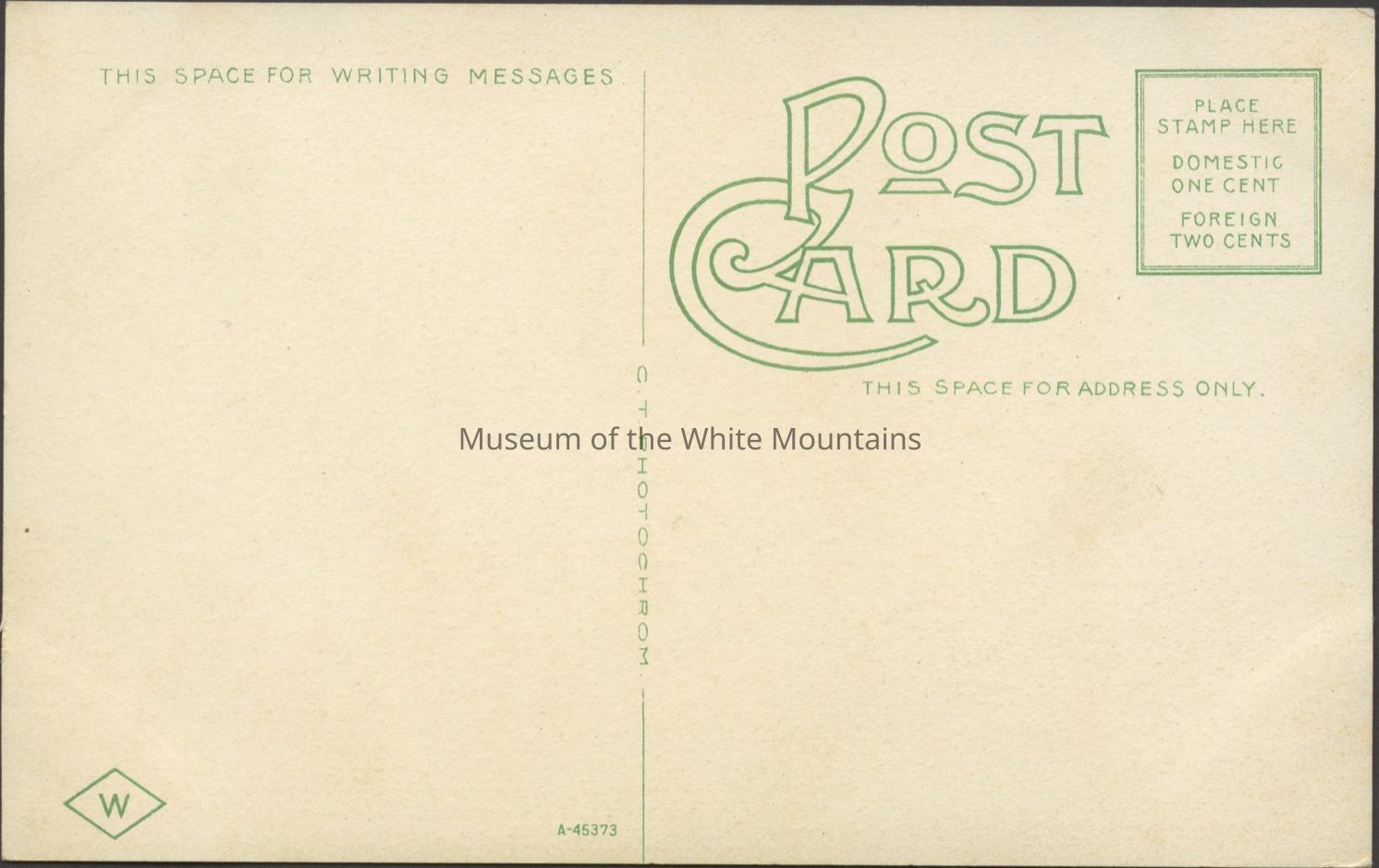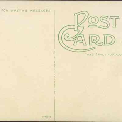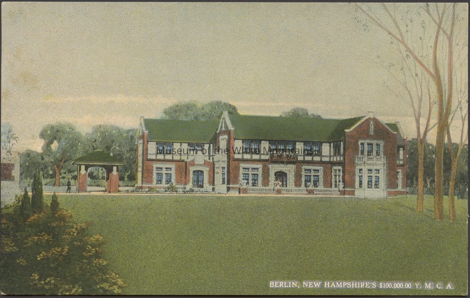 Colored image of a large brick building with stone or wood detailing. Includes a portico and a person walking in a walkway. Caption reads, “Berlin, New Hampshire's $100,000.00 Y.M.C.A.”