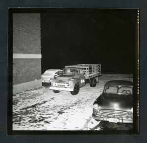 Black and white photograph of a truck. The truck is parked next to a building. Another car is behind it covered in snow. On the bottom right is an additional car. On back stamped in ink, "Photograph by Dan Noel, Dec 6 1957." Written in pencil, "661."