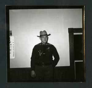 Black and white photograph portrait of a man in what appears to be a police uniform. He is standing in the middle. On left there is a eye sight poster. On the right is a doorway. On back stamped in ink, "Photograph by Dan Noel, Dec 6 1957." Written in pencil, "662."