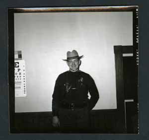 Black and white photograph portrait of a man in what appears to be a police uniform. He is standing in the middle. On left there is a eye sight poster. On the right is a doorway. On back stamped in ink, "Photograph by Dan Noel, Dec 6 1957." Written in pencil, "663."