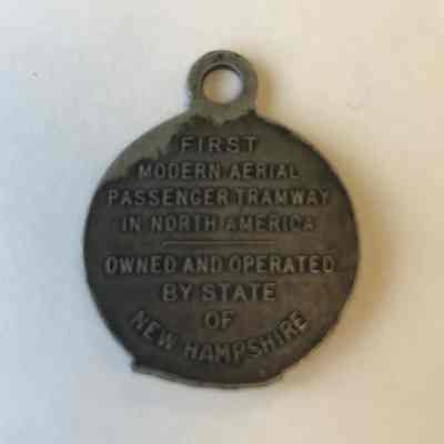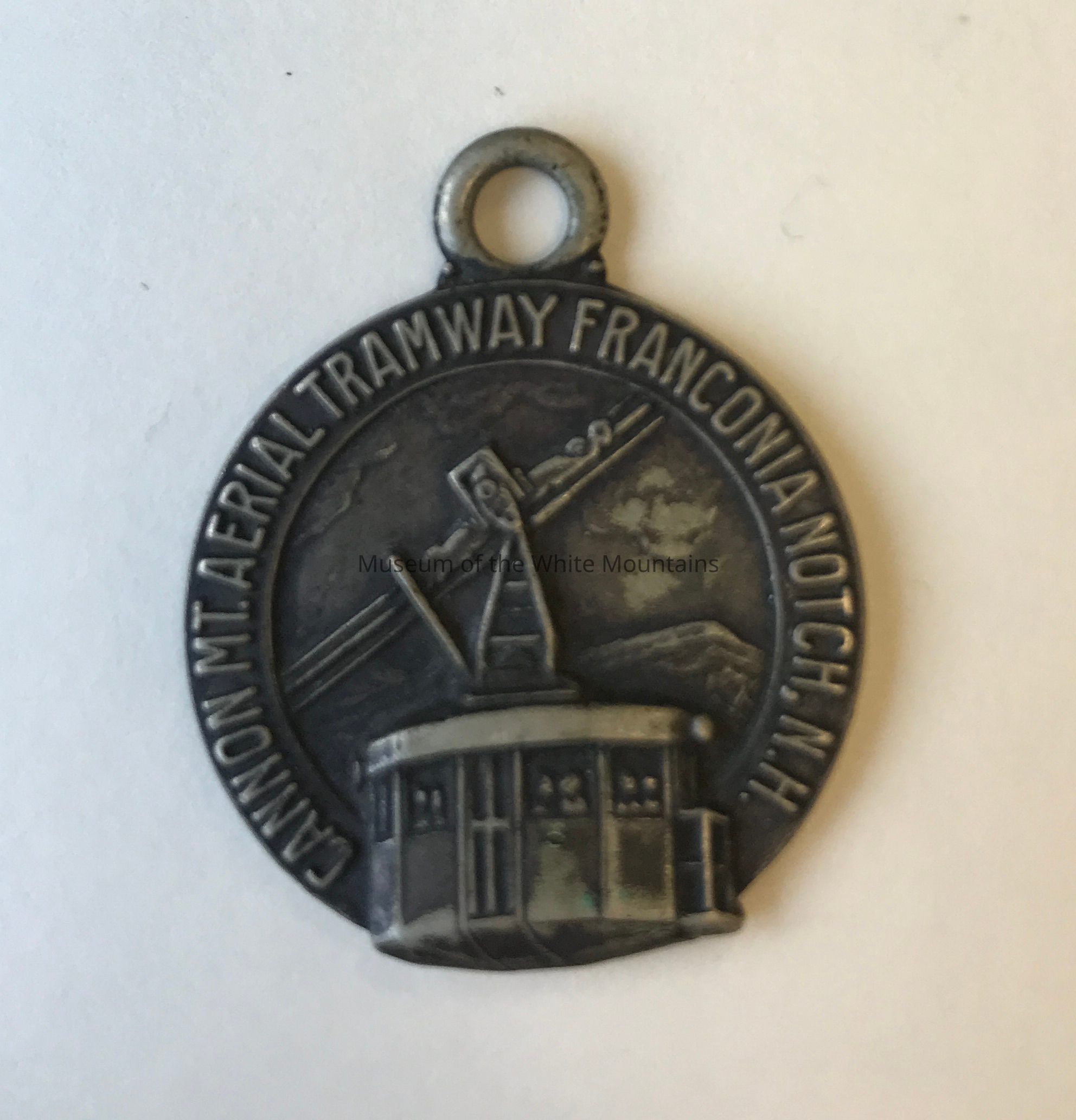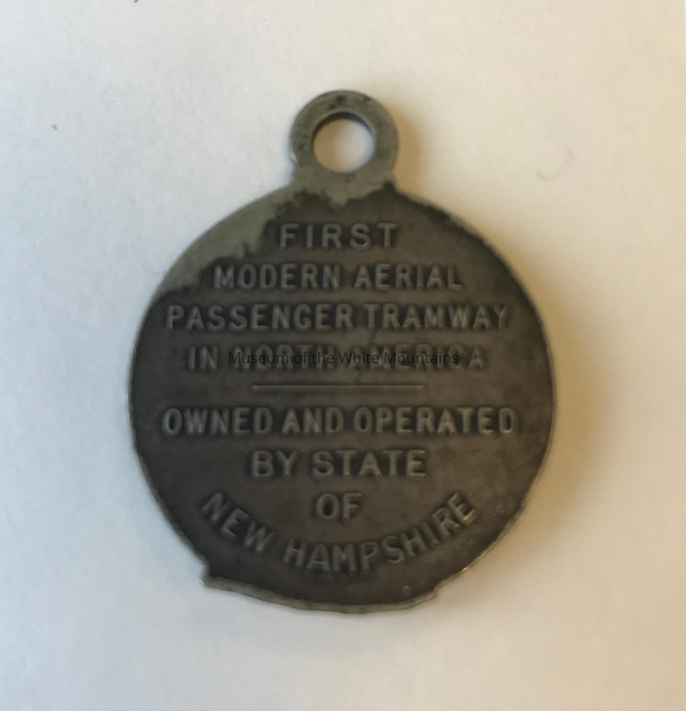 Cannon Mt. Aerial Tramway tourist souvenir. Small round metal pendant depicting a tram car. Marked "First modern aerial passenger tramway in North America. Owned and operated by State of New Hampshire" on the reverse. The pendant has some wear and a worn finish in areas. Item is undated, circa 1938.Acquisition