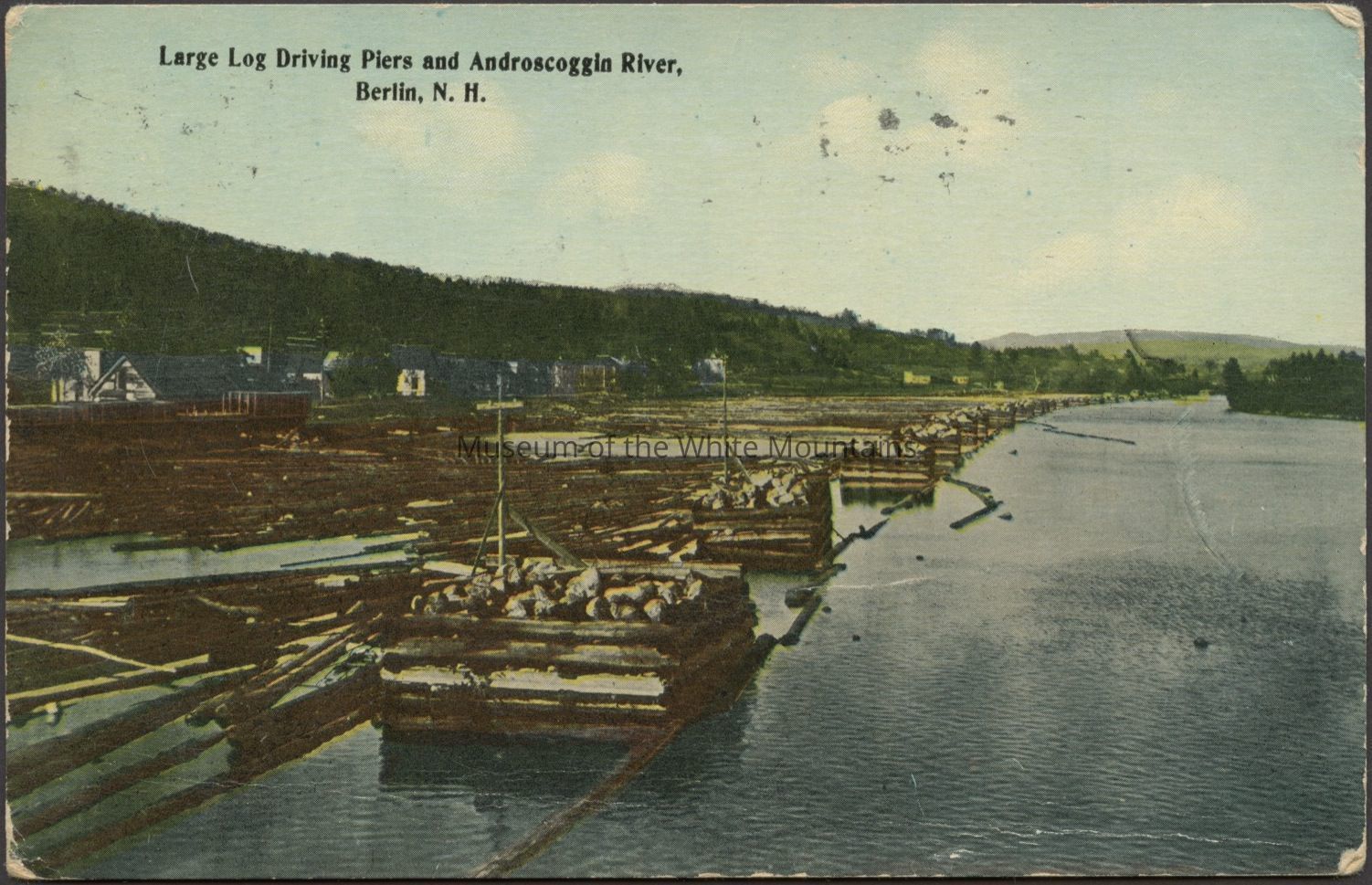 Colored image of body of river and its shore lined with buildings and a pier. At the pier are large containers floating with logs in them. Caption reads, “Large log driving piers and Androscoggin River, Berlin NH.”
