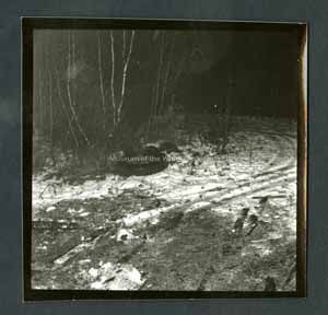 Black and white photograph of a tire. The tire is by a few small trees. On back stamped in ink, "Photograph by Dan Noel, Dec 7 1957." Written in pencil, "664."