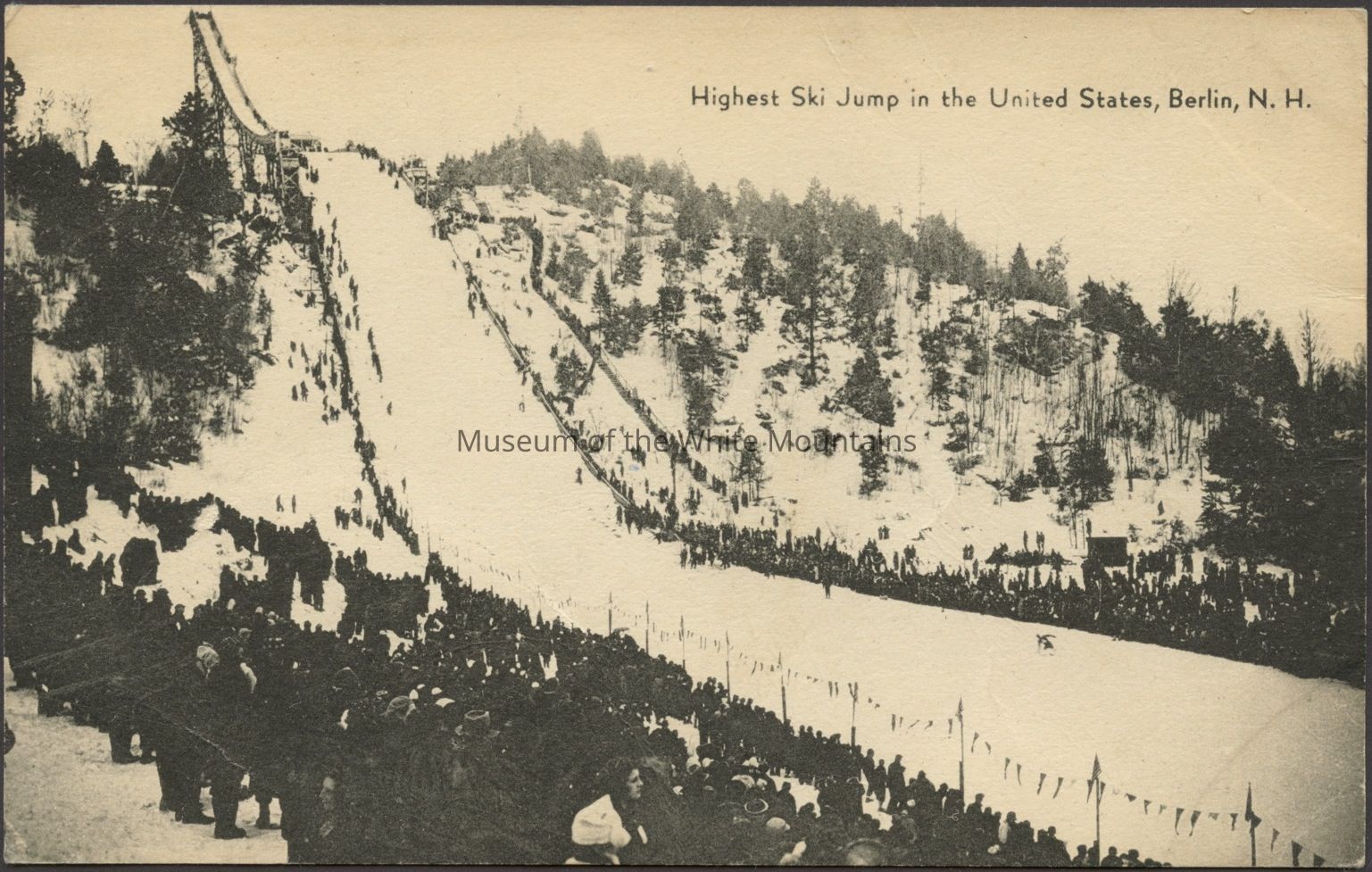 Black and white image of a ski jump in the winter. Caption reads, “Highest ski jump in the United States, Berlin NH.”