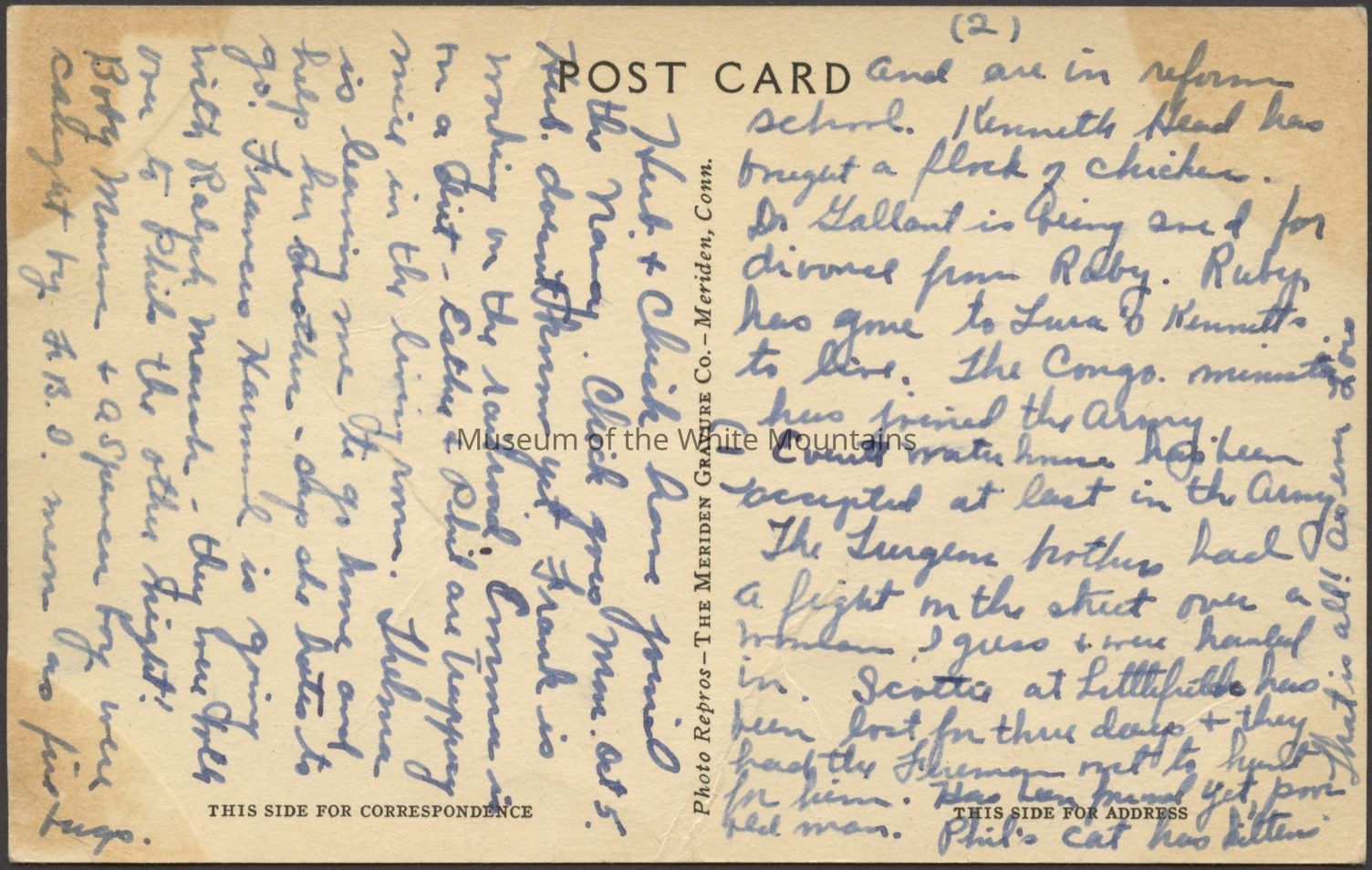 Transcription: "Hub and Chick hav joined the navy. Chick goes Mon. Oct % Hub Doesn't know yet. Frank is working on the railroad. Emma is in a Dirt. Esthy and Phil are trapping mice in the living room. Thelma is leaving me to go home and help her mother- she hates to go. Francis Hamond is going with Ralph Marsh - they were both over to Phil's the other night! Boby M…+ a Spencer boy were caught by FBD men as firebugs and are in reform school. KennethHead has bought a flock of chickens. Dr. Gallant is being sued for divorce from Ruby. Ruby has gone to …Kennett's to live. The congo m. has joined the army. Everette Waterhouse has been accepted at last in the Army. The Turgen brothers had a fight on the shut over a woman. I guess there …in. Scottie as Littlefield has been lost for three days + they had the firemen over to … for him. Has been .. yet, pour red men. Phil's cat has kitten. That is all! As ever, Lois"Collection