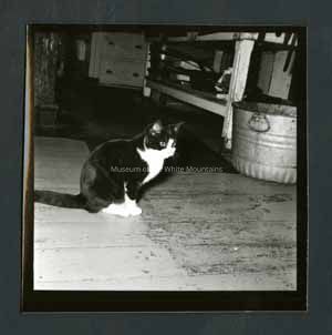 Black and white photograph of a cat. The cat is sitting in the middle. On the right is a bucket in front of a table with dishes on it. In the background are drawers. On back stamped in ink, "Photograph by Dan Noel, Dec 8 1957." Written in pencil, "669."