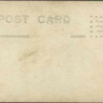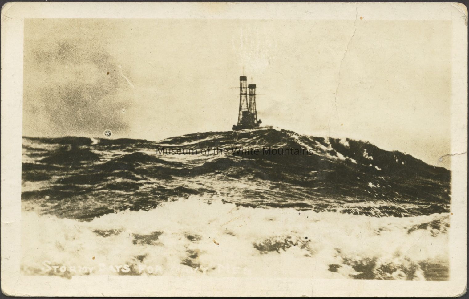 Black and white image of rough water with a structure on or in it. Back Description: Typical postcard back.