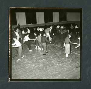 Black and white photograph of a school dance. Students are in the gym dancing. Some are sitting on benches in the back. On back stamped in ink, "Photograph by Dan Noel, Dec 6 1957." Written in pencil, "673."