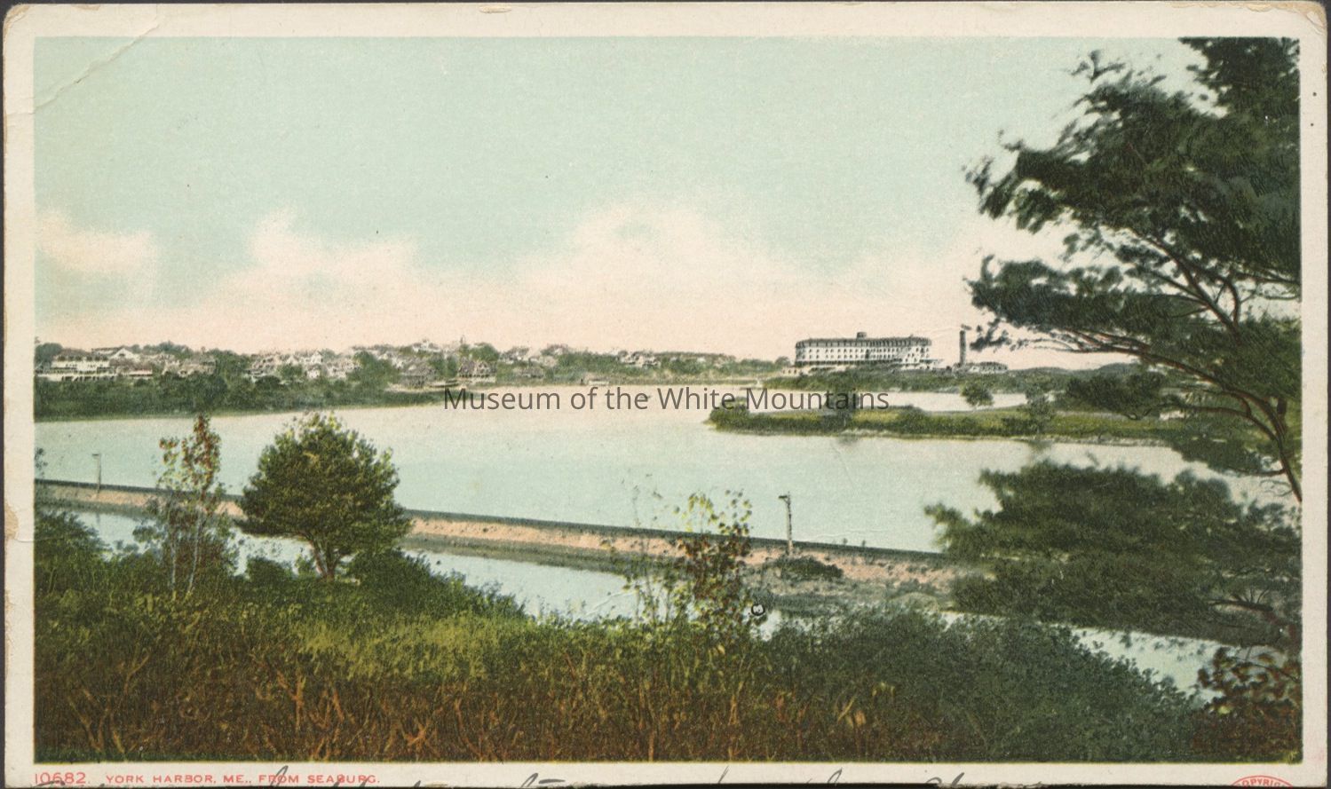 Colored image of a body of water across which is a large building and a town. Caption reads, “York Harbor ME from Seaburg.”