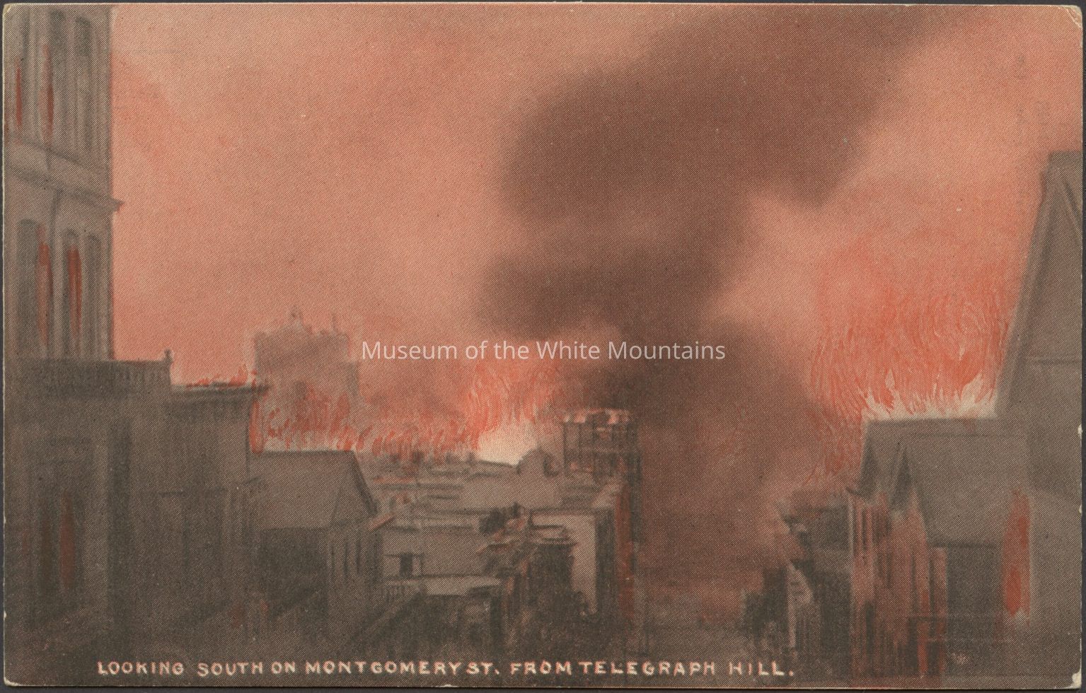 Colored image of a city on fire. Caption reads, “Looking south on Montgomery St. from Telegraph Hill.”