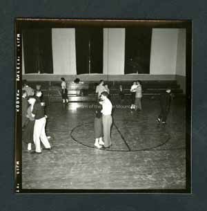 Black and white photograph of a school dance. Students are in the gym dancing. Some are sitting on benches in the background. On back stamped in ink, "Photograph by Dan Noel, Dec 6 1957." Written in pencil, "683."
